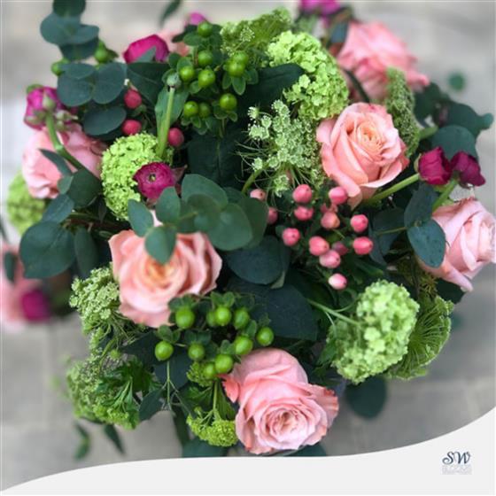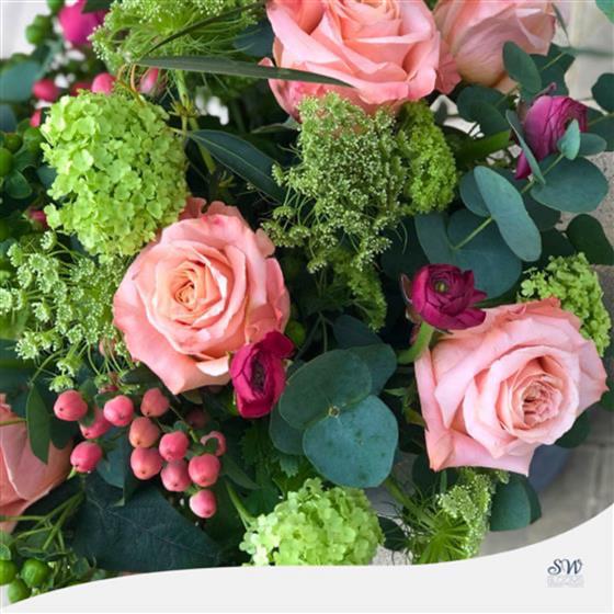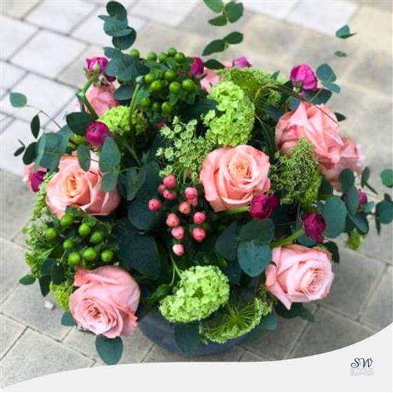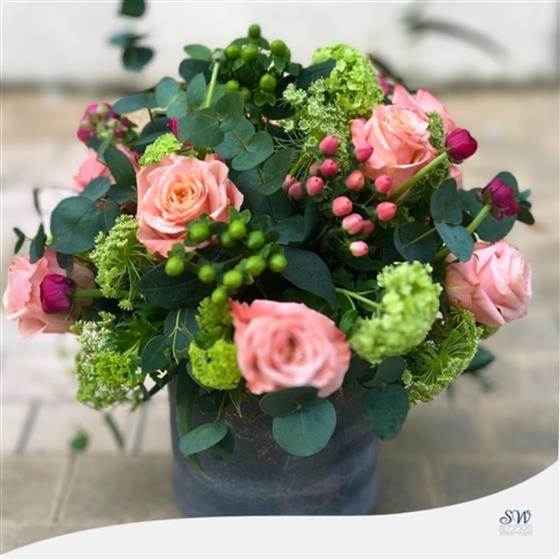 Indulge in the elegance of our exquisite flower arrangement expertly crafted and beautifully presented in a charming ceramic pot. This delightful ensemble features a harmonious blend of Green Viburnum, Shimmer Roses, Mixed Hypericum Berry, Ranunculus and assorted Eucalyptus leaves. Elevate any space with the enchanting beauty of these carefully curated blooms, adding a touch of nature's sophistication to your surroundings.