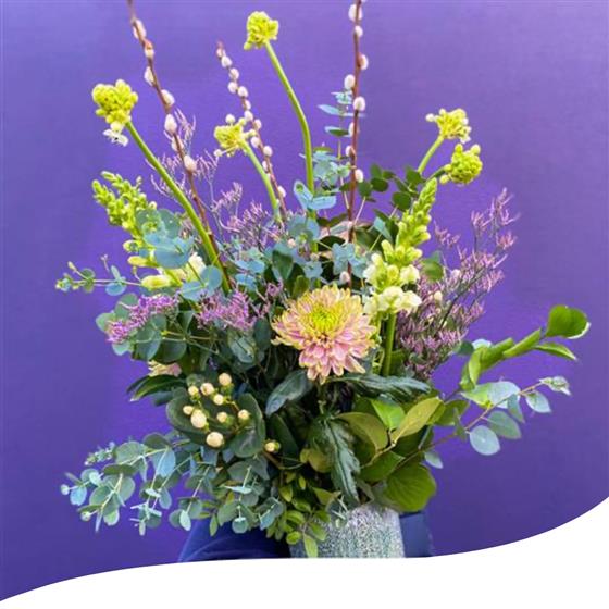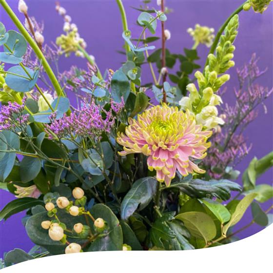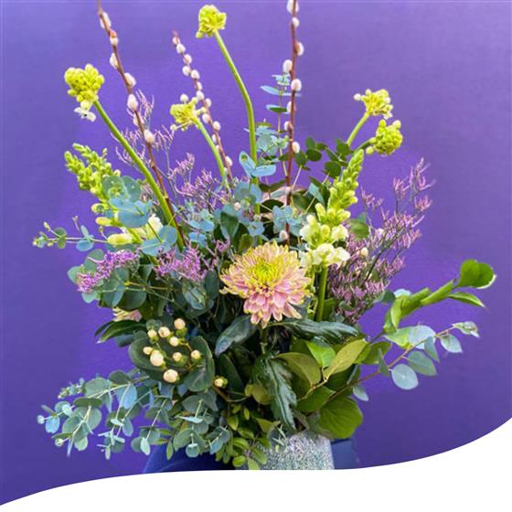 Our Purple Majesty Garden arrangement exudes elegance and charm, capturing the essence of a regal garden in full bloom. This hand-tied bouquet features a harmonious blend of Snap dragons/Antirinums, LImonium, Pussy Willow, Chrysanthemum and more creating a captivating tapestry of colour. The arrangement is skilfully crafted to showcase the natural beauty of each bloom, with lush greenery interwoven to enhance the overall texture and vibrancy.