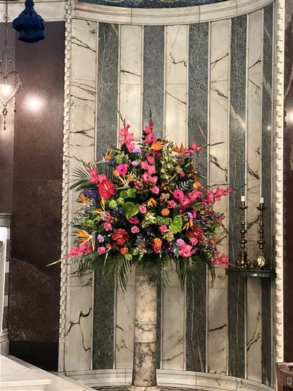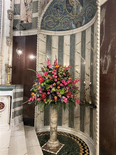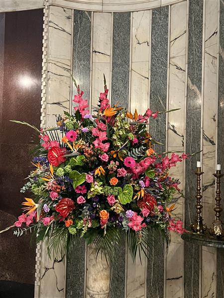 A stunning tropical selection of vibrant flowers arranged into a front facing pedestal.