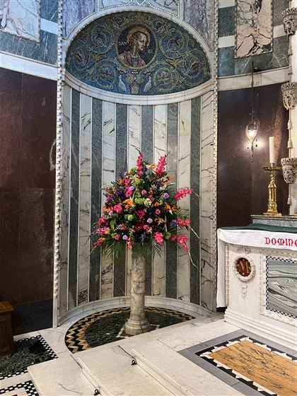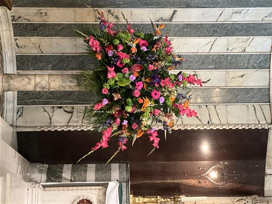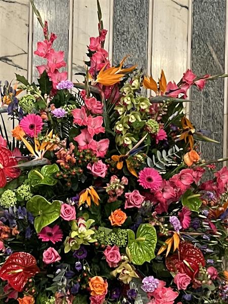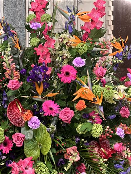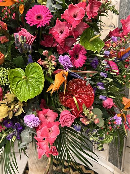 We used Birds of paradise Strelitzia, Red and Green Anthuriums, Cerise Gladioli, Orange and Pink Roses, Cymbidium Orchids, Purple Lisianthus, Green Viburnums, Red Hypericum and Orange Snapdragons.
