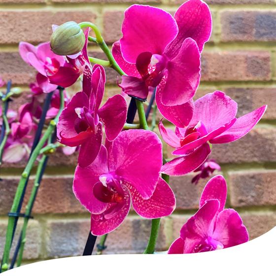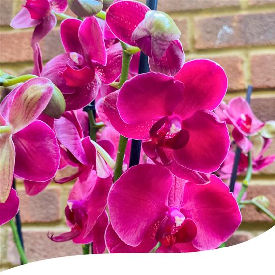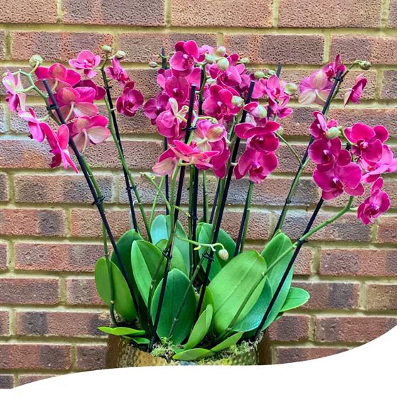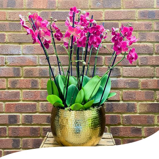 Elevate any space with the elegance of our Vivid Pink Phalaenopsis Orchids. Planted in a stunning golden vase, this exquisite arrangement features 11 stems of mixed Pink Phalaenopsis Orchids.