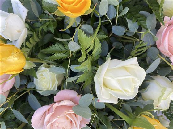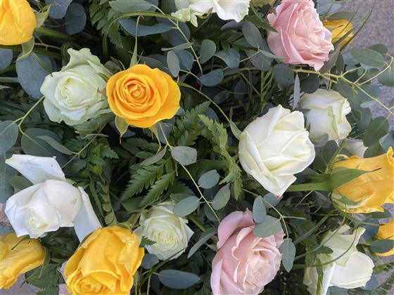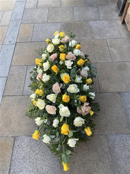 6 Foot White, Yellow & Peach Rose Coffin Spray with mixed foliage. We make sure to have the freshest & most vibrant roses for your day.