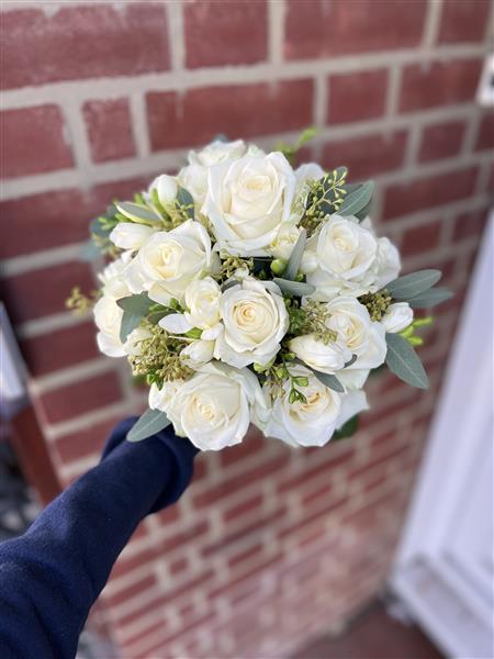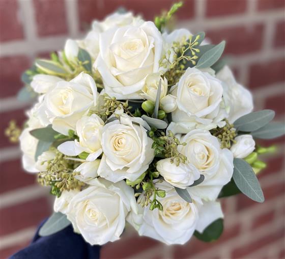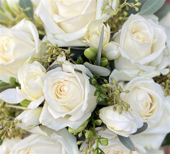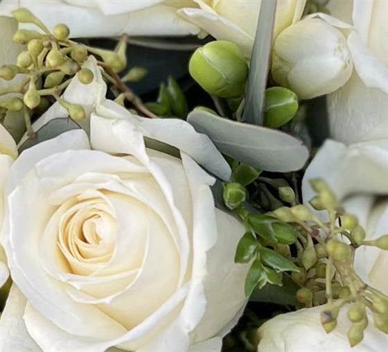 Arranged with berried Eucalyptus in between the delicate freesias. Perfectly open White Avalanche Roses finished with choice of stem wrap but we would recommend a nice white satin ribbon.