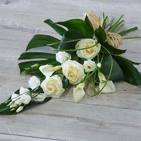 Graceful callas lilies meet large headed roses and rich green foliage in an elegant, neutral design.
