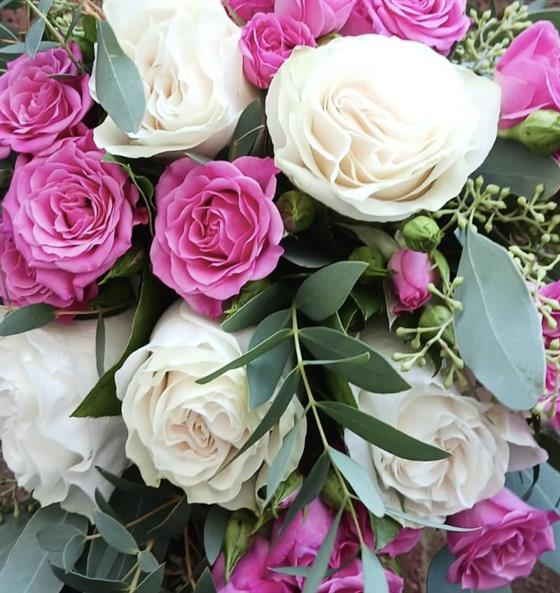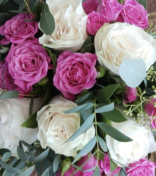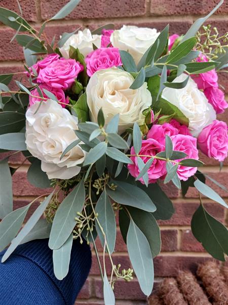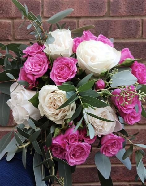 White Moonlight Roses and Pink Lianne Spray Roses into a Bouquet with Parvi Eucalyptus and Mixed Populous Eucalyptus with Berries.