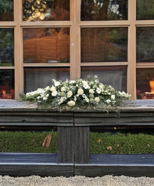 A top table arrangement made with the most beautiful white and green seasonal flowers.