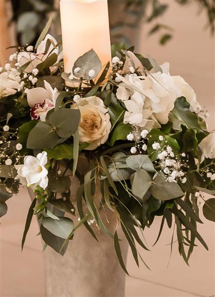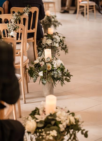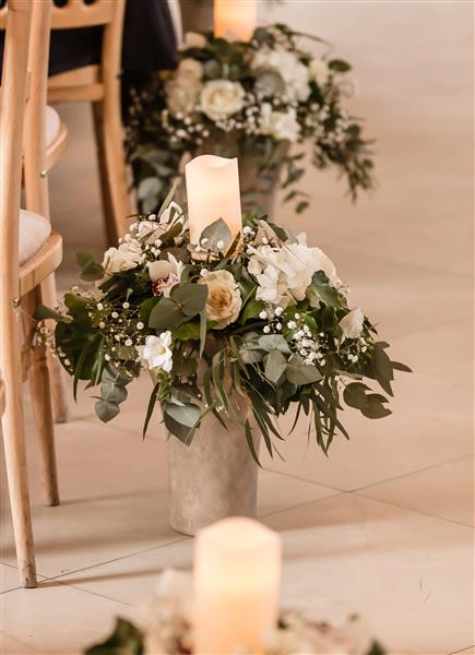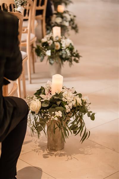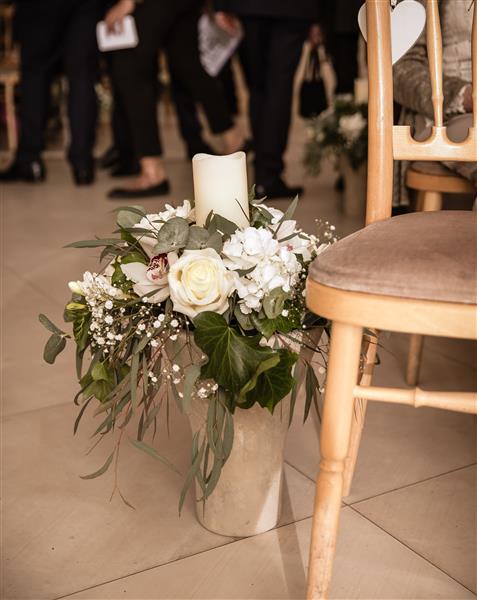 A white and cream aisle flower arrangement. We will use a nice set of cream pots to create a beautiful arrangement that can sit at the end of the aisle. They can also then be used for venue decorations after the ceremony. We will use a choice of roses, Lisianthus, Cymbidium Orchids, Eucalyptus, Hydrangea, Freesia and Gypsophila.