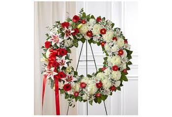 Pure white roses, Pink and white Oriental Lily, White carnations and mixed spray chrysanthemums are beautifully arranged to form an elegant wreath accented wth lush and vibrant greens. Displayed on a wire easel, this stunning tribute is a wonderful symbol of eternal life.