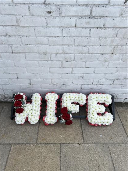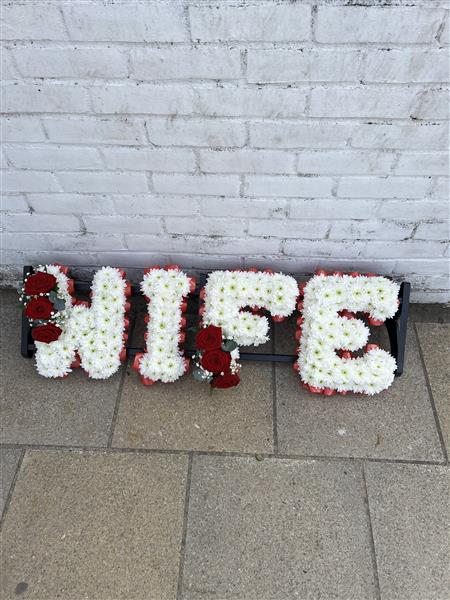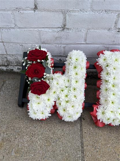 Pictured is red ribbon edge with red rose sprays on a bed of white Chrysanthemums.