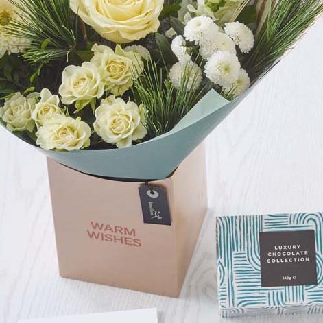 A handcrafted on trend bouquet in a lovely Christmas gift box, plus a lovely card and chocolate selection.