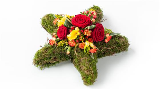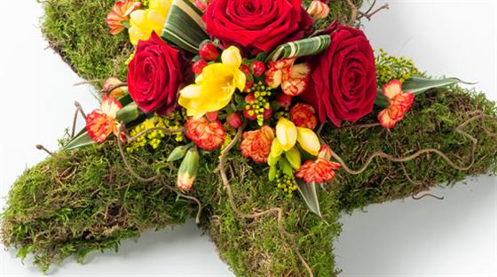 This distinctive, star-shaped tribute features a central spray of vibrant red roses, bright orange and cream two-tone spray carnations and sunny yellow freesia, which is against a bed of moss and trimmed with foliage and twigs.