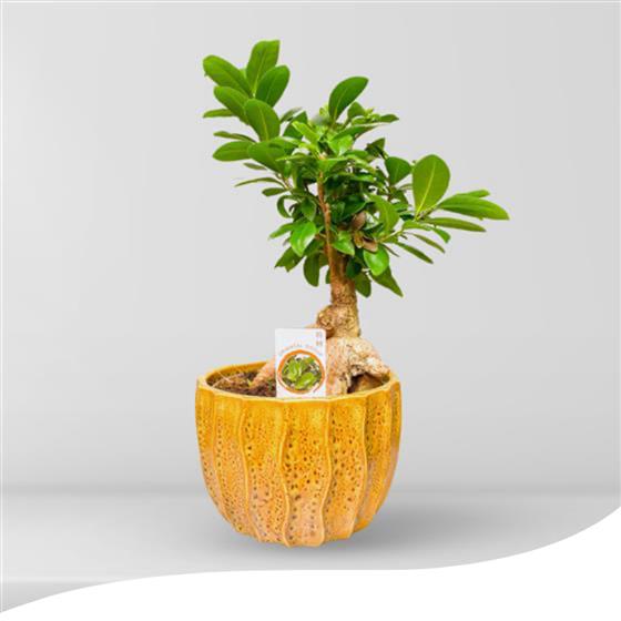 Introducing our Ficus Bonsai, a symbol of tranquility and natural beauty meticulously cultivated for your space. This miniature marvel, adorned with gracefully shaped leaves and an intricate trunk, effortlessly brings the essence of the outdoors into your living space. With its enduring charm and low-maintenance nature, the Ficus Bonsai transcends being merely a plant; it's a living work of art that infuses a sense of peace and coziness into any environment. Elevate your space with the captivating allure of our Ficus Bonsai – a timeless embodiment of harmony and serenity, presented in a charming pot. Pot may vary.