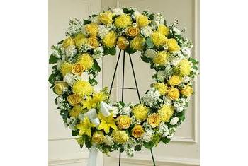 Bright Yellow Roses, Asiatic Lily, carnations and spray chrysanthemums are beautifully arranged to form an elegant wreath accented wth lush and vibrant greens. Displayed on a wire easel, this stunning tribute is a wonderful symbol of eternal life.