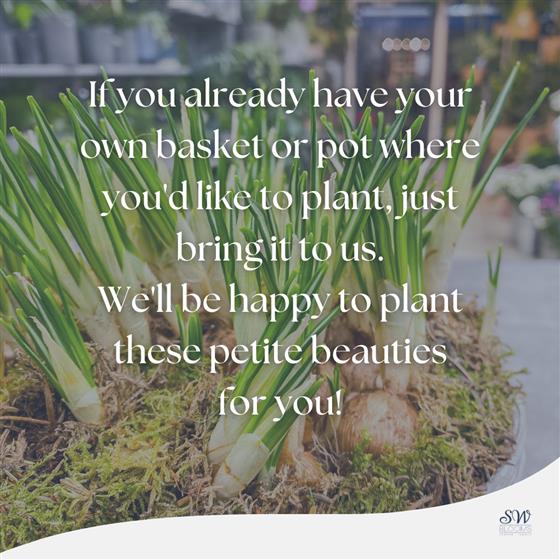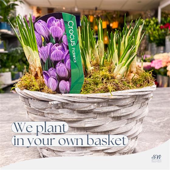 Create Your Own Crocus Bulbs Basket - If you have a special basket or pot at home waiting to be filled with floral beauty, bring it to us! We'll gladly plant these charming Crocus bulbs for you. Starting at just £35, the final price may vary based on the size of your basket or pot. When reaching out, kindly provide the dimensions. We're here to bring your floral vision to life!