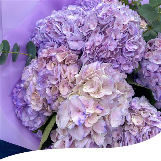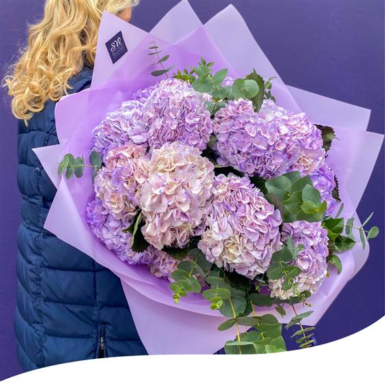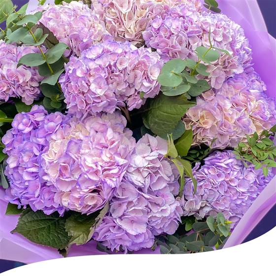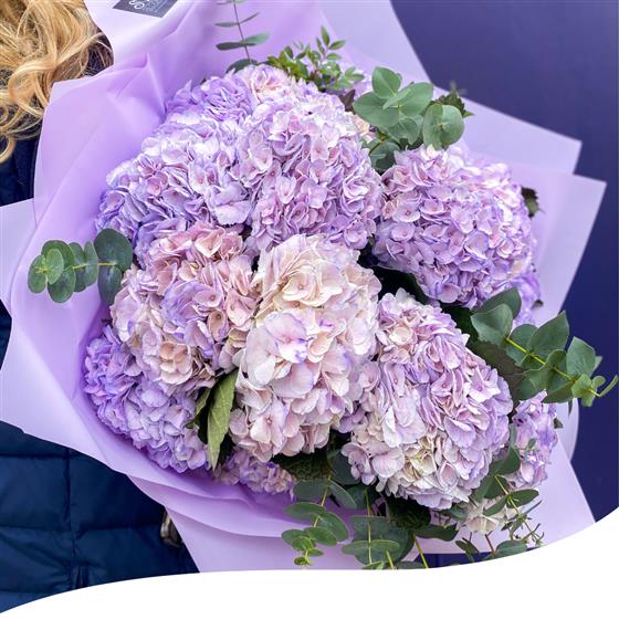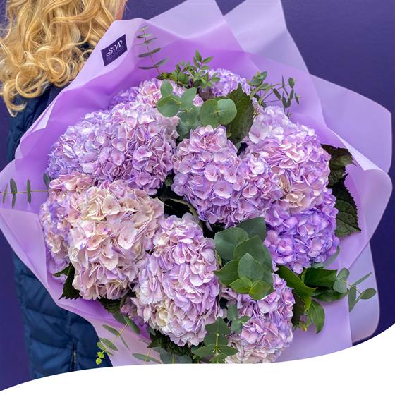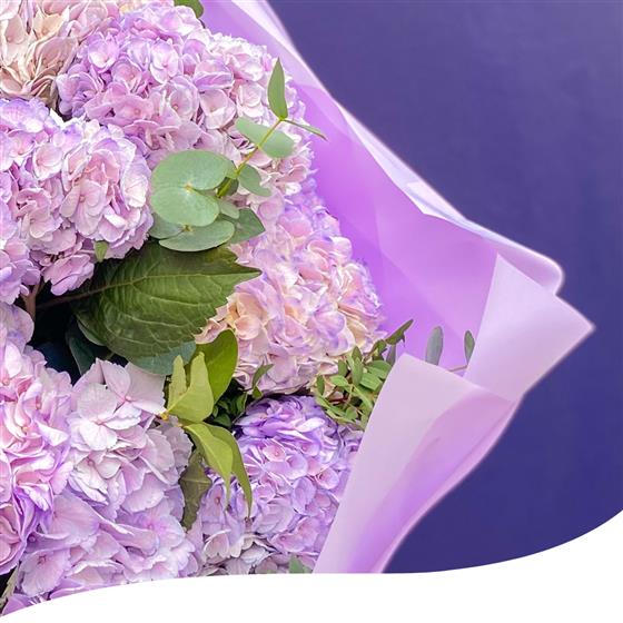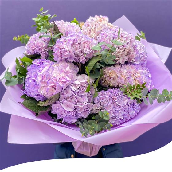 Enhance your gesture with our stunning Royal Purple Hydrangea Elegance bouquet, crafted to enchant your loved one. Featuring 12 lovely purple hydrangeas paired with aromatic eucalyptus, this elegant arrangement is a perfect way to convey your emotions for any occasion and will surely be memorable.